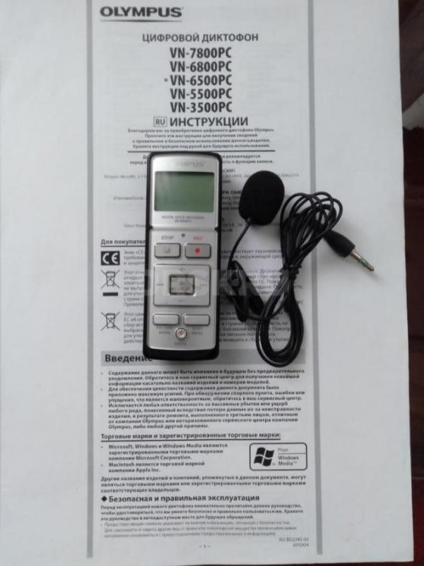 Цифровой диктофон OLYMPUS VN6500PC +выносной микрофон+аккумуляторы.