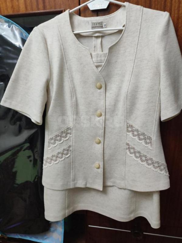 Костюм женский трикотажный, состоит из жакета и юбки, и на жакета, и на юбке вставки из плетеного